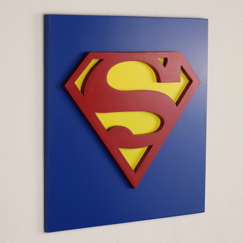 Na vytvorenie 3D efektu je drevený znak Supermana vyrobený a zložený z 2 vyrezaných dielov a každý z nich je zvlášť lakovaný do svojej farby.